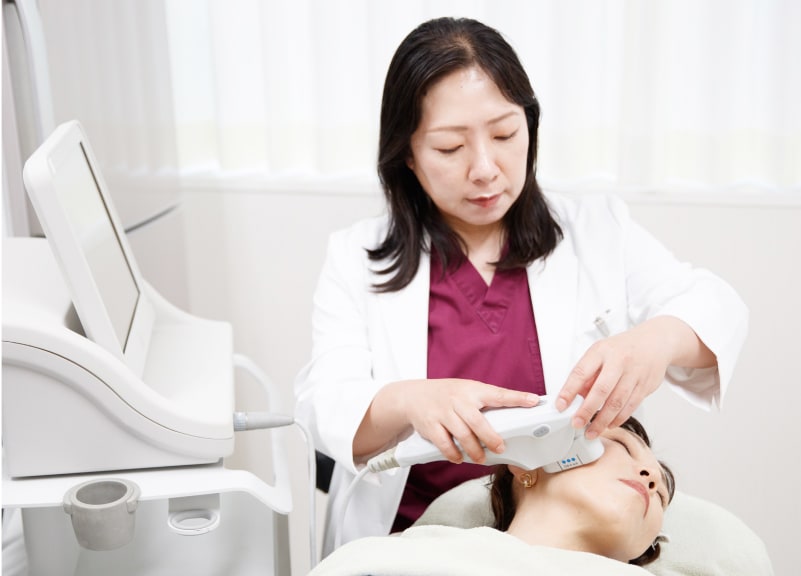 ウルセラは、超音波エネルギーを点状に照射することで、肌内部のコラーゲン線維が熱により縮み、肌を引上げます(リフトアップ)。