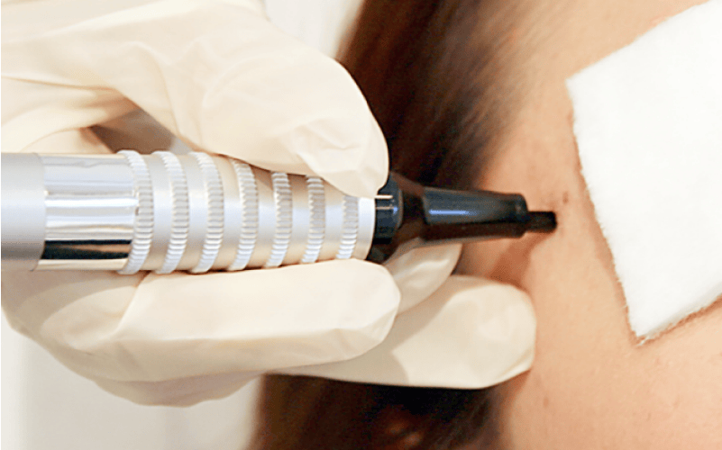 炭酸ガスレーザーは、皮膚の水分に反応するため、ほくろ、イボなどを蒸散する(焼き切る)ことができます。照射後は、1~2週間は絆創膏で覆っていただきます。照射部位は、最初は少し凹んでいますが、1~2ヶ月でほぼ平らになり赤みもひいていきます。