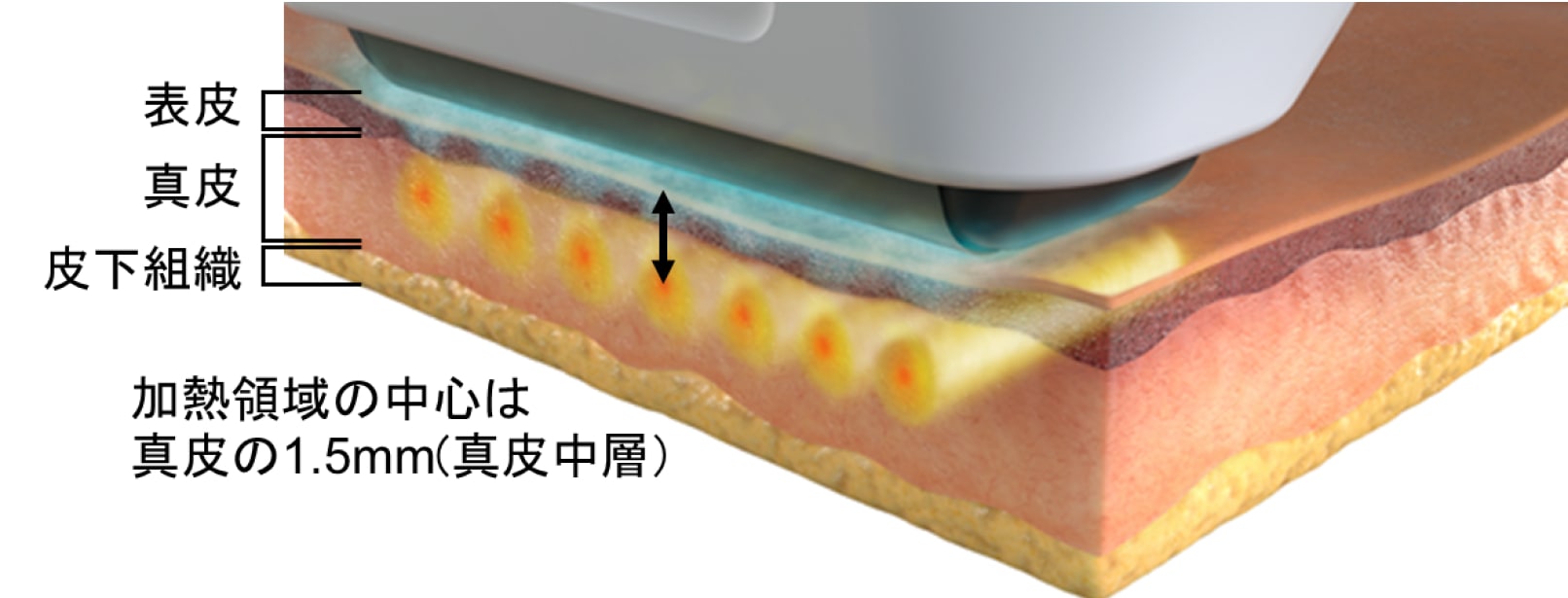 ソフウェーブは、高強度、高周波数の超音波ビームを1.5mmの深さの真皮中層に円柱状に照射することで、肌内部のコラーゲン線維が熱により縮み、肌を引き上げます(リフトアップ)。