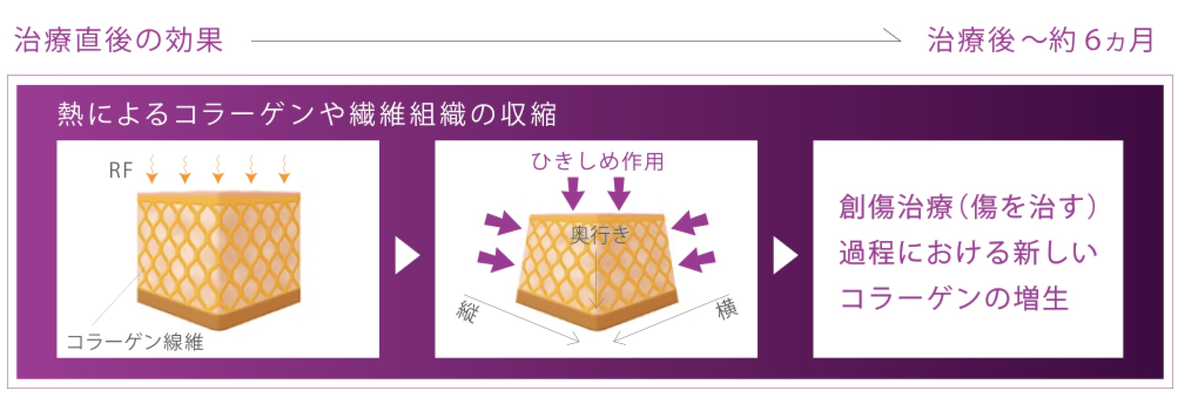 サーマクールは高周波(RF、ラジオ波)を照射することで真皮や皮下組織を加熱し、コラーゲン線維を収縮・再生することでたるんだ肌を引き締めます。照射直後から効果を感じ、その後約1年程度持続します。